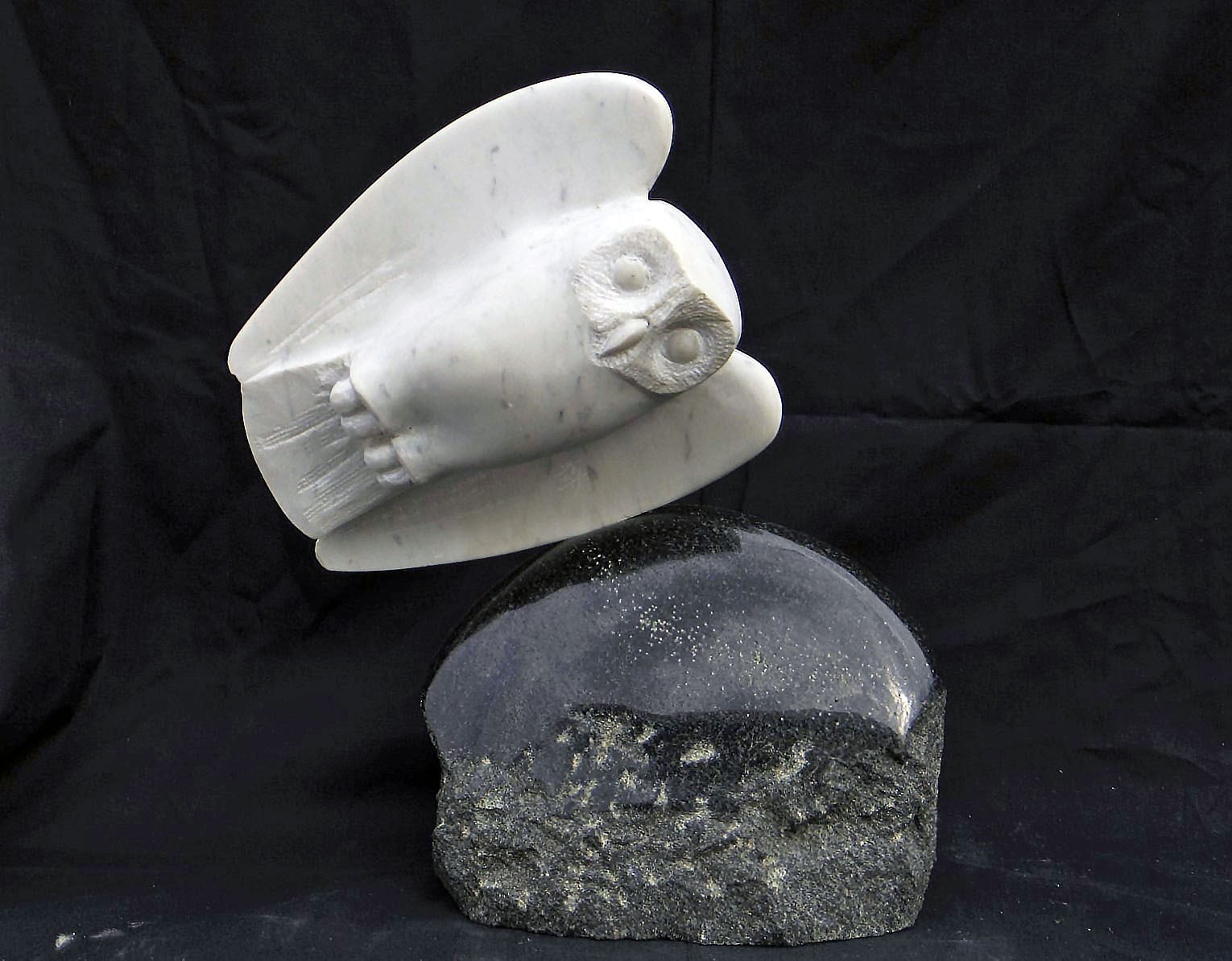 約35cm×30cm×15cmのサイズで、重さ約4kgのこの作品は、深い闇に包まれた空の中で、白い梟が星々を見上げながら飛ぶ姿を表現しています。見る人に愛や希望のメッセージを届けるかのようです。
