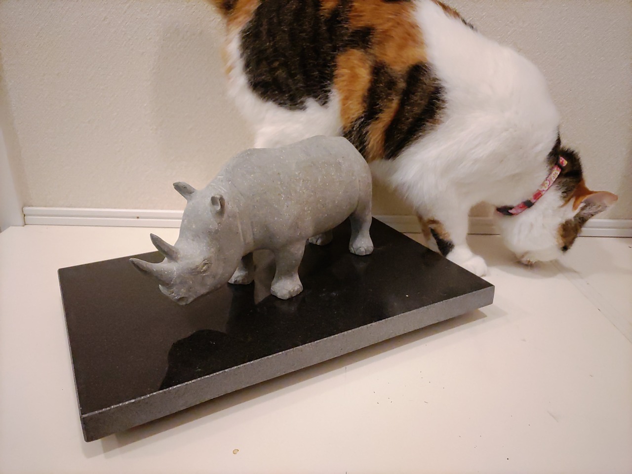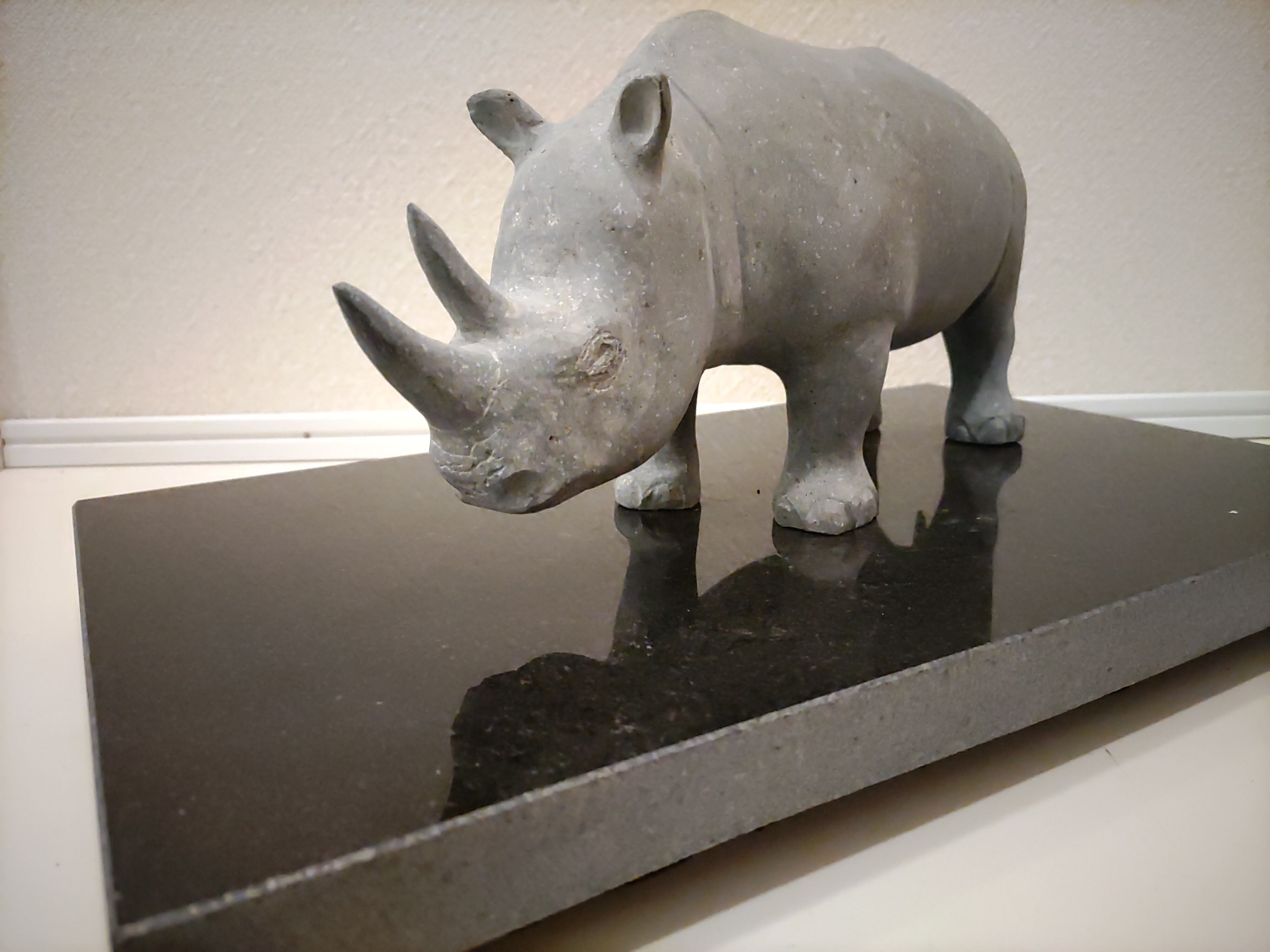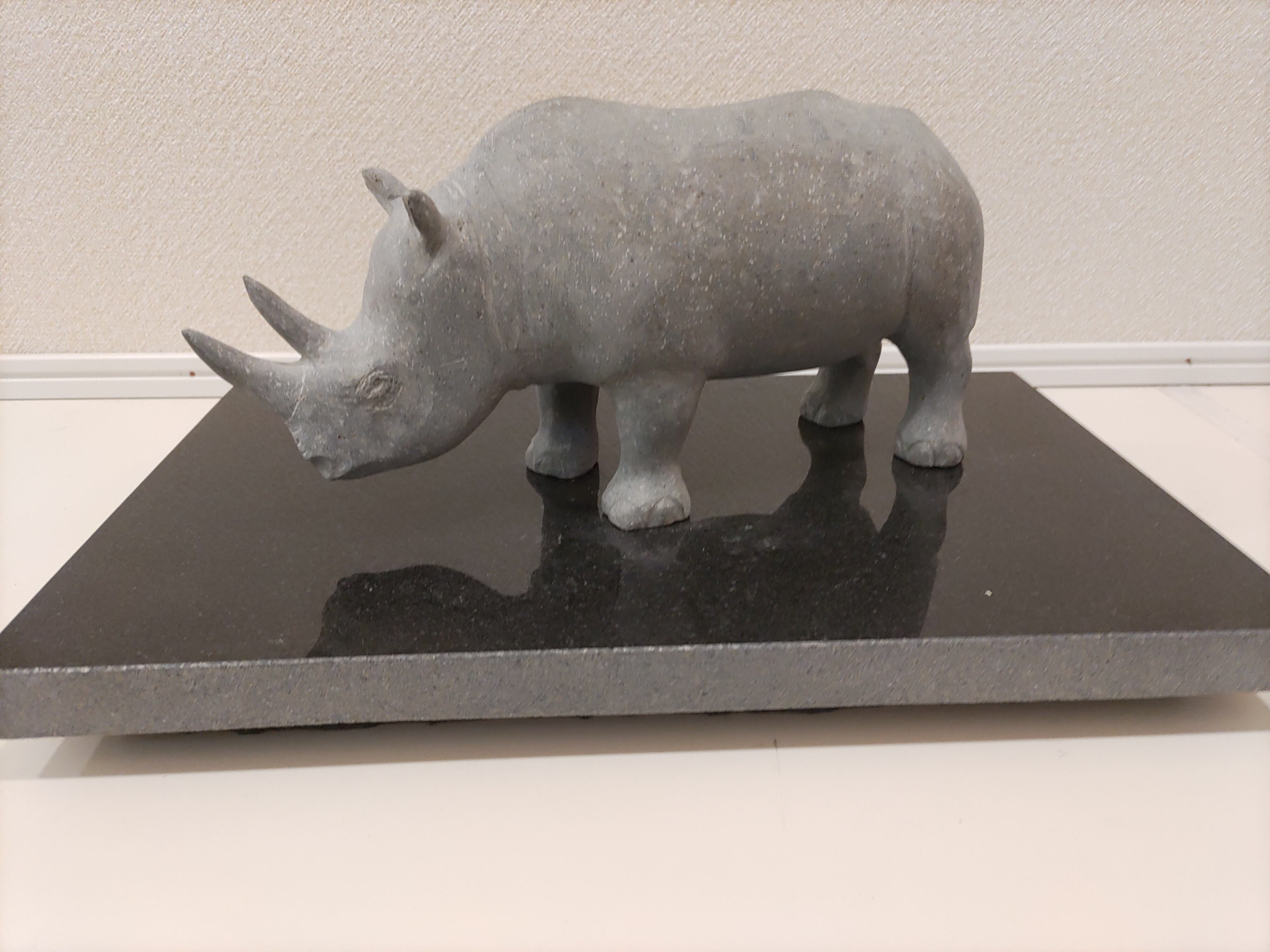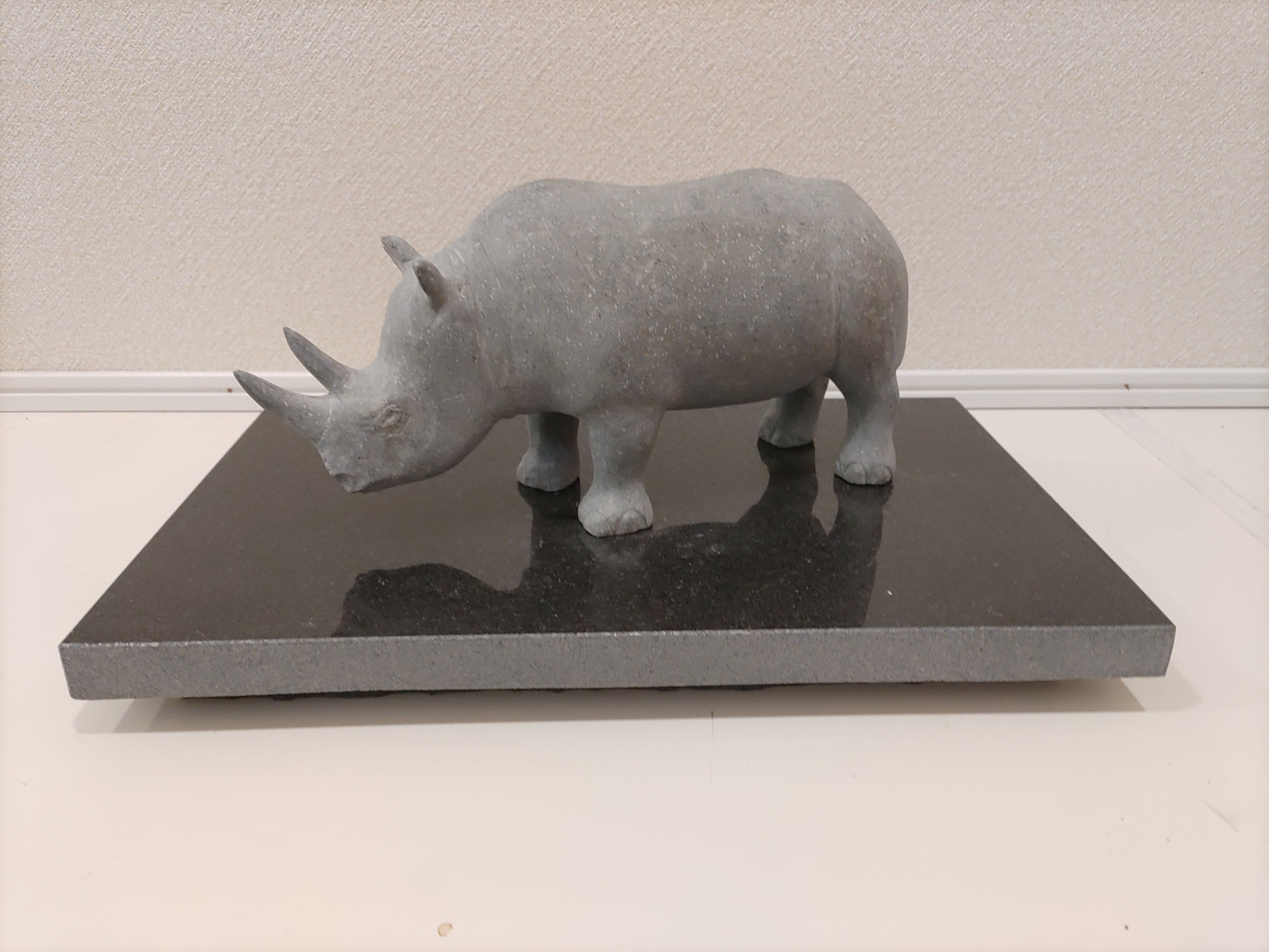 真鶴産の安山岩(小松石)を手に取ると色が白サイによく似ていると思いこの作品を作りました。台座の黒御影石は磨いてあり、夜のアフリカの大地の雰囲気が出ればと思っています。