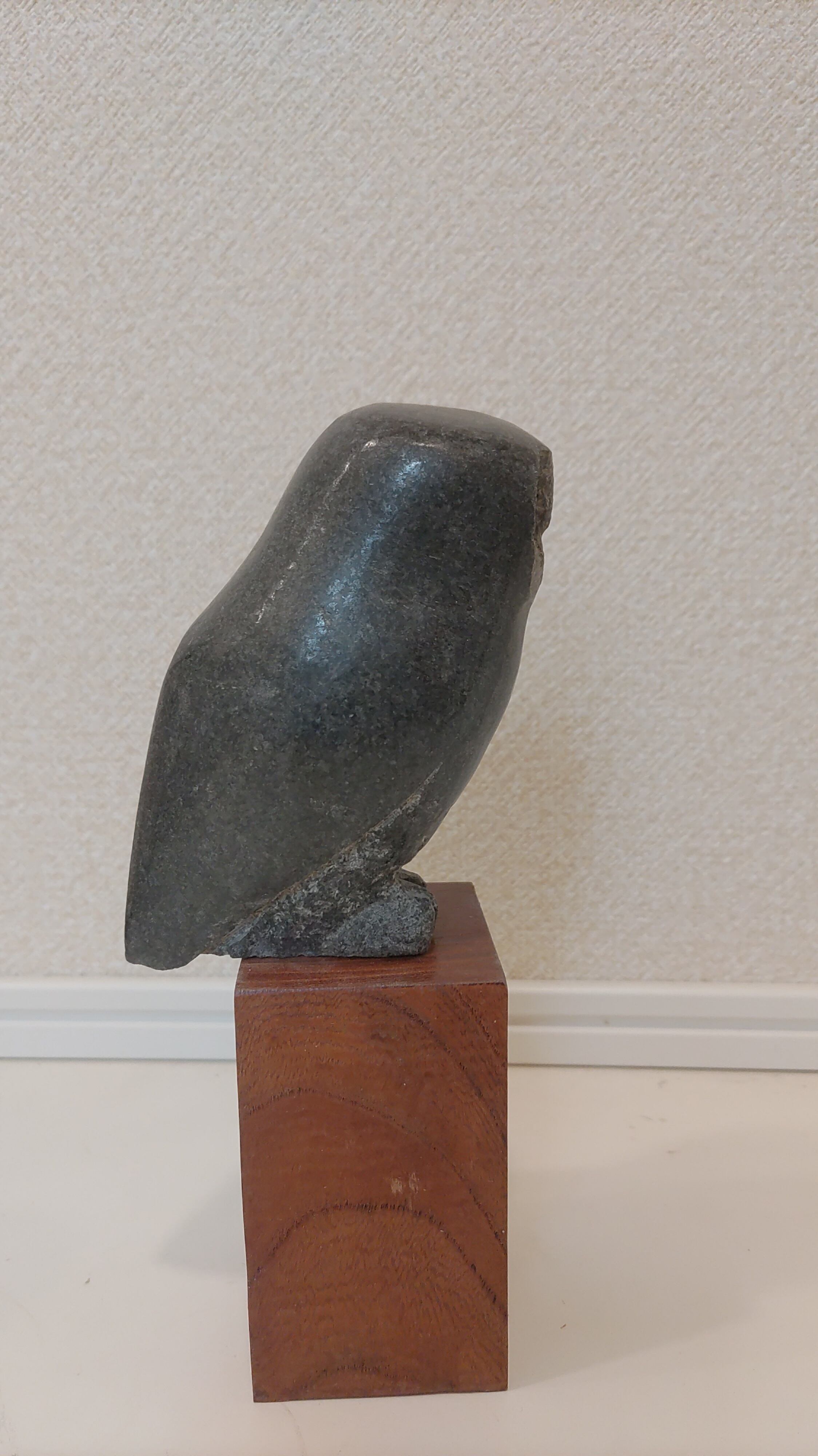 この作品は、まるでフクロウが「コンニチハ」と挨拶をしているような仕草を表現しています。小さな石の作品ながらも、意思を持ったような表情は、見る人の心を和ませてくれること間違いありません。