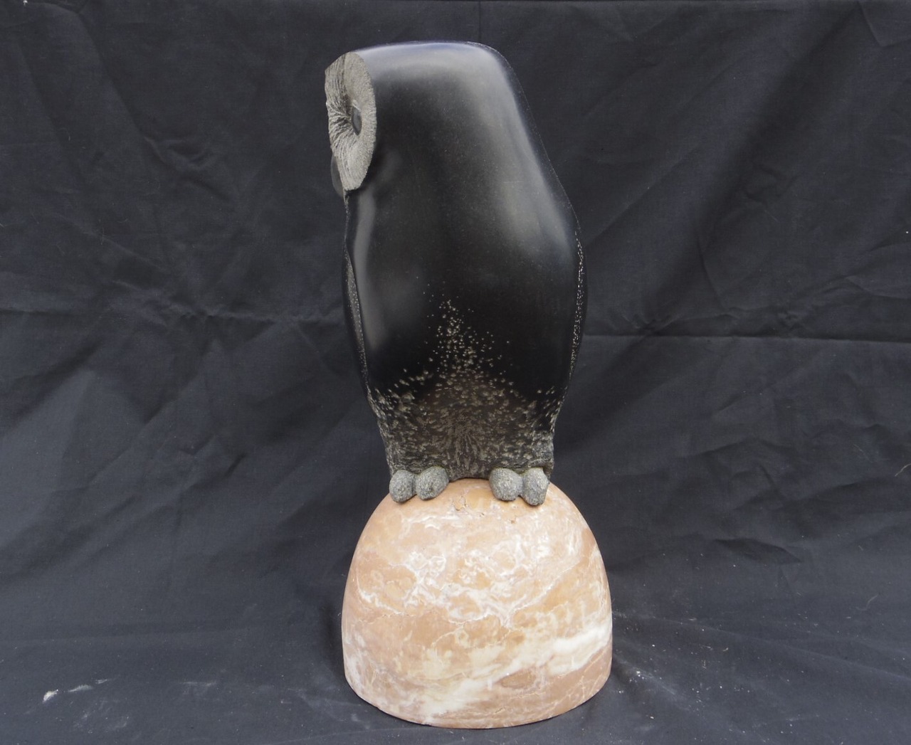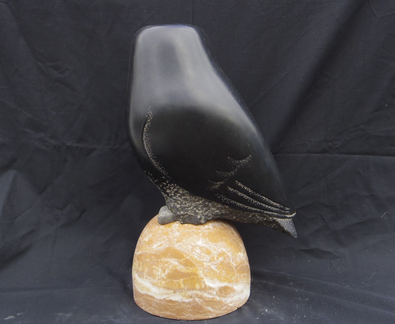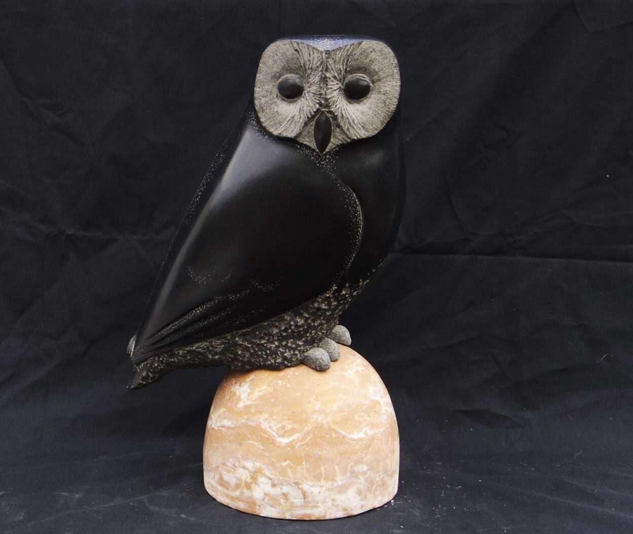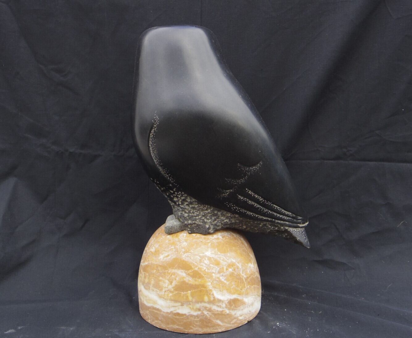 黒御影石でできたフクロウが赤い大理石の上に乗っている作品です。赤い大理石は磨くと宇宙の赤い惑星のようなマーブル模様が浮かび上がり、まるで異世界にいるような感覚を味わえます。そして、そこに佇むフクロウは、まるで守り神のような存在であり、何かを見守ってくれているように思えるでしょう。