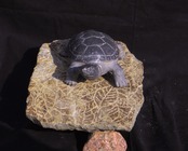 25cm×18cm×10cmのサイズで、重さ約3kgのこの作品は、黒大理石と小松石を使用し、日本固有種のイシガメの姿を表現した彫刻です。亀が杜の中を優雅に歩く様子が、細部まで丁寧に作り、台部分の筋彫りされた枯れ葉のデザインも印象に残るとおもいます。