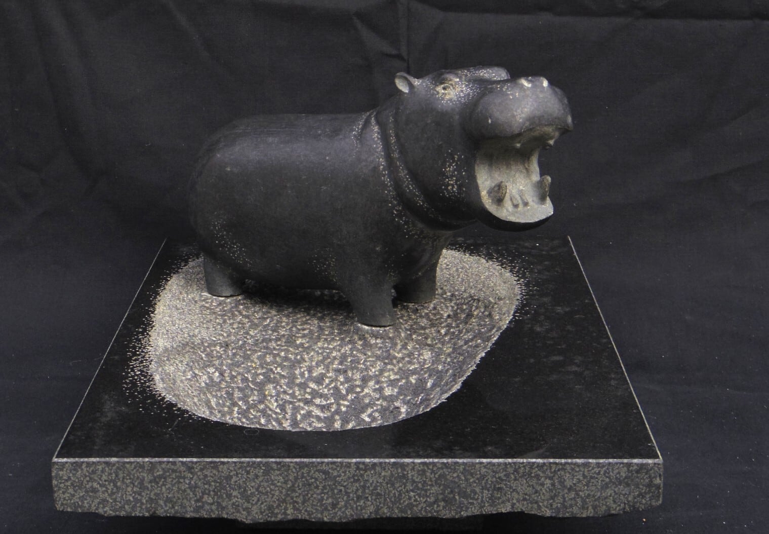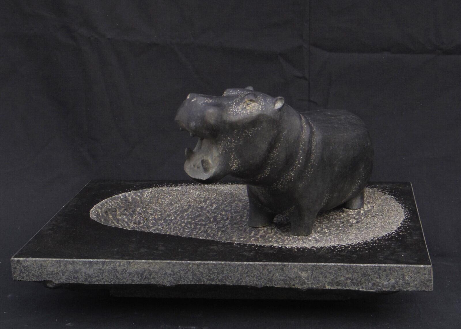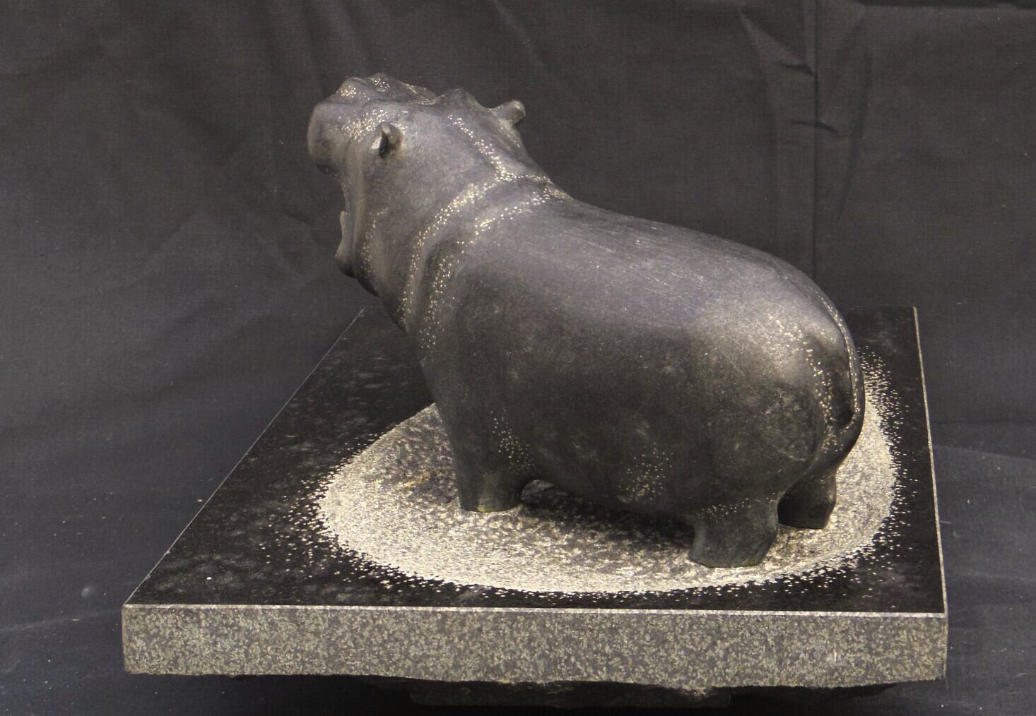 約35cm×25cm×18cmのサイズで、重さ約9kgのこの作品は、黒御影石を使用し、水をためる窪みに河馬を配置した彫刻です。水辺にいる河馬のイメージを想起させ、見る人に自然の息吹を感じてもらえるよう工夫しました。