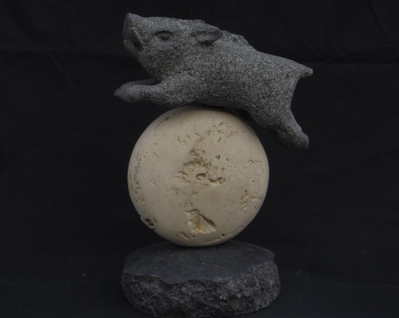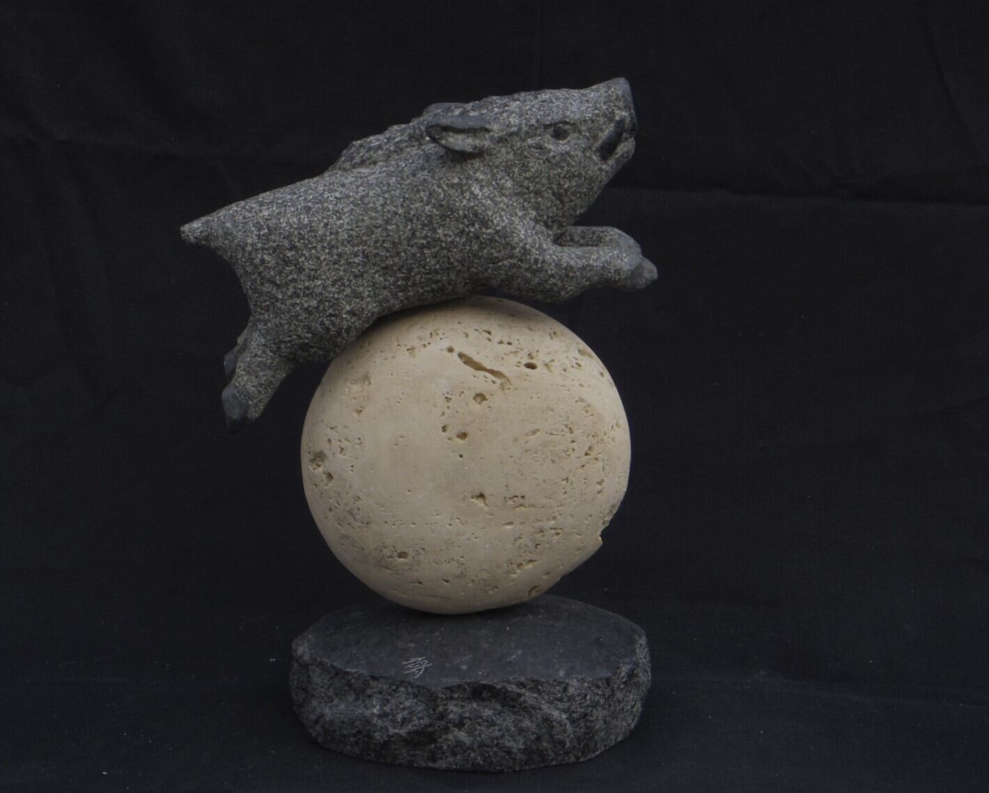 この作品は、黒御影石とトラバーチンを使用し、猪突猛進で突っ走るイノシシがその勢いのまま天空の月を飛び越える姿を表現した彫刻です。力強く、またどこかユーモラスなイノシシの姿が、見る人に勇気と活力を感じて頂けると嬉しいです。
